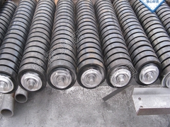 缓冲托辊安装在输送机受料段的下方,减小落料时物料对输送带的冲击,以延长输送带的使用寿命.缓冲托辊的间距一般100-600毫米。