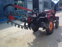 通过四联带将动力系统中柴油机的转动传递到减速系统中的减速箱后驱动安装在其上的主链轮,主链轮带动与之啮合的链条转动。刀具安装在链条上,在动力系统的驱 动下,链条带动刀具转动加平动,从而实现开沟。采用本方案所述链条式开沟机,可实现所挖沟槽深浅一致,宽度均匀且尺寸可调,大大提高了挖掘质量和效率。 链条式开沟机采用了30马力以上的动力,为开挖不同宽窄的沟型,可以改装成单双链条两种,可开挖宽度10-80公分不等,深度可达1.8米的沟型,本实用新型特点是开挖速度快,一般情况下300-600米/小时,最高可达600米/小时,故障率低,简单实用。